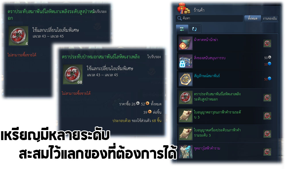 2. ตราประทับสมาพันธ์ : เป็นไอเทมที่ใช้สำหรับแลกเปลี่ยนสิ่งของกับ "NPC สมาพันธ์" โดยการแลกเปลี่ยนนั้นยังมีเงื่อนไขอื่นๆ เข้ามาร่วมด้วย อาทิ ระดับของเหรียญ, ระดับขั้นของฝ่าย, ความสำเร็จ (กด U เพื่อตรวจสอบ) และอื่นๆ