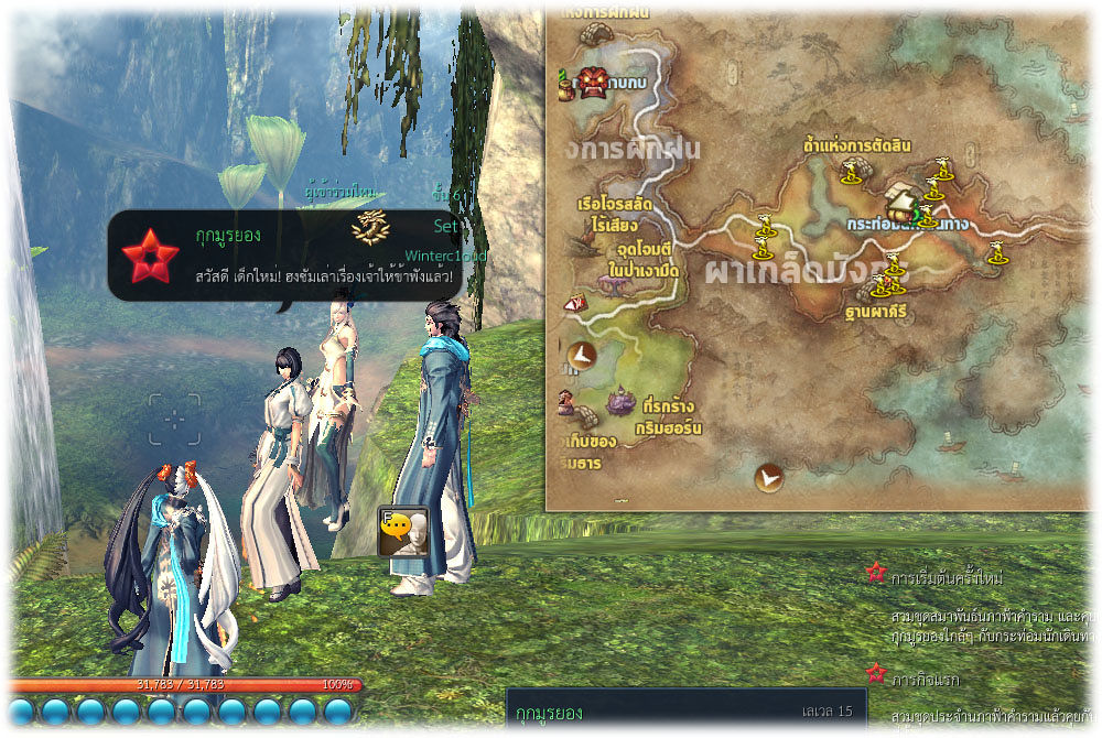 TR.1 เนินเขามังกร > ผาเกล็ดมังกร > กระท่อมนักเดินทาง : NPC จะยืนอยู่บนยอดผา โดยเควสให้เราไปเก็บแร่มาส่ง