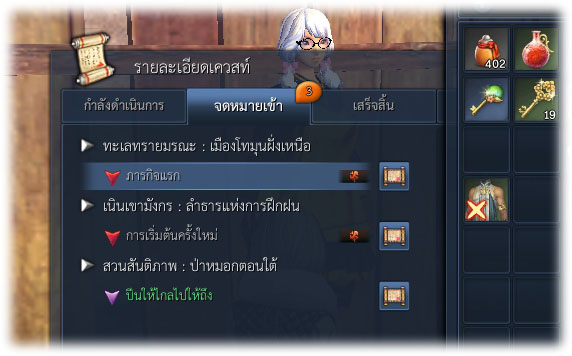 ทำได้หลังจากผ่านเควสเนื้อเรื่องโจรกลุ่มทมิฬในช่วงแรกแล้ว (ประมาณเลเวล5) จะมีจดหมายเควสส่งมาที่มุมขวาล่าง ให้กดเข้าไปหน้าที่สอง > จดหมายเข้า จากนั้นกดอ่านเควส "เสียงสรรค์" ที่ปรากฎไว้ในรายการ (ดังรูป)