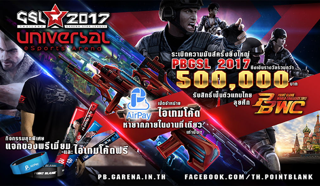 Point Blank ก็ไม่น้อยหน้า เชิญร่วมเป็นสักขีพยานการค้นหาตัวแทนประเทศเพื่อไปร่วมรายการ PBWC2017 ที่ประเทศรัสเซีย รับรองว่าโหด... ตามมาด้วยการชิงแชมป์ของสาวๆ ใน Lady Tournament และสำหรับผู้เข้าร่วมงานสามารถลงทะเบียนเพื่อแข่งขันในรายการ Mini Tournament แบบ 2v2 ทั้งหมดนี่เงินรางวัลรวมกว่า 500,000 บาท หาคู่หูแล้วซ้อมกันให้ดีๆ นี่ยังไม่รวมการเปิดตัวไอเทมชุดใหม่รุ่น GSL2017 และไอเทมโค้ดในเกมอีกด้วยนะ