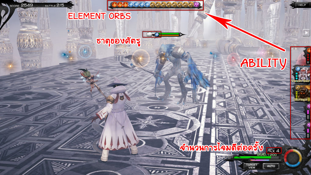 - หากพูดง่ายๆมันก็คล้ายๆกับสกิลของเรานี่แหละ ในการใช้ Ability นี้จำเป็นต้องมี Element orbs ให้เพียงพอต่อการใช้งาน ภายในรูปจะเห็นจำนวนขีดที่แสดงถึงจำนวน Element orbs ที่เราต้องเก็บเพื่อเรียกใช้งานอยู่ และจะต้องเก็บ Element orbs ให้ตรงตามธาตุของแต่ละ Ability ซึ่งธาตุในเกมช่วงเริ่มเล่นจะมีอยู่ด้วยกัน 5 ธาตุคือ Fire ธาตุไฟสีแดง, Water ธาตุน้ำสีฟ้า, Wind ธาตุลมสีเขียว, Earth ธาตุดินสีน้ำตาล และ Life สกิลซัพพอร์ตสีม่วง ซึ่งภายหลังจะมีเสริมให้อีก 2 ธาตุคือ Light ธาตุแสงสีขาว และ Dark ธาตุมืดสีดำ ภายในเกมจะมี Ability Card ให้เลือกใช้มากมาย สามารถเลือกเล่นได้ให้ตรงกับสไตล์การเล่นของคุณเอง