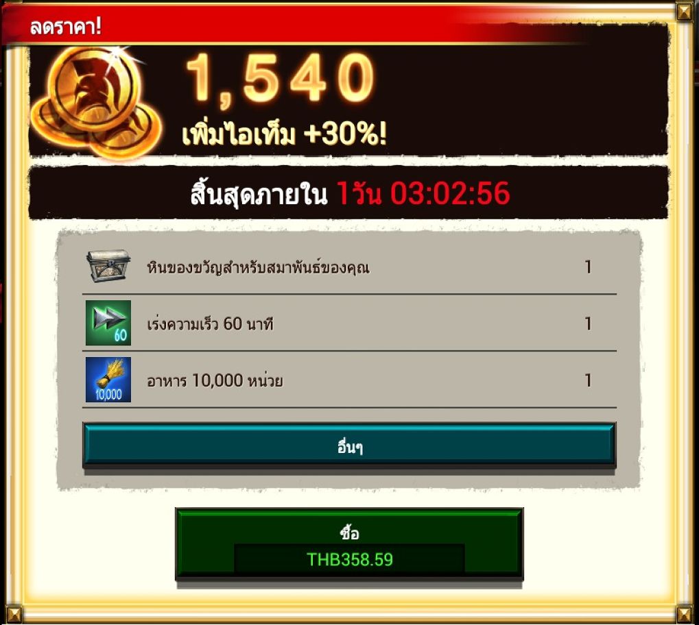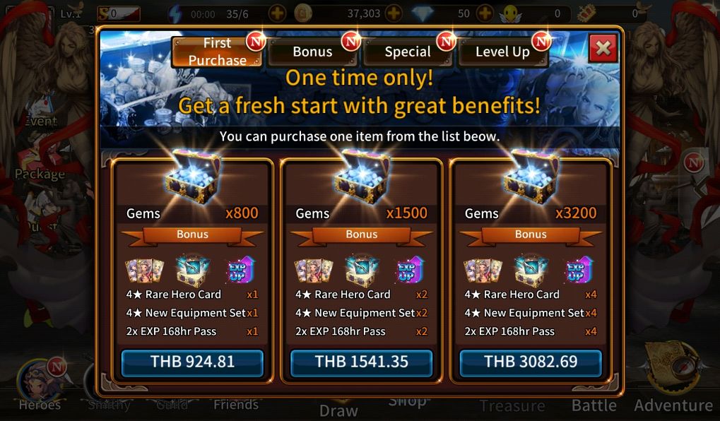 เป็นโปรโมชั่น ซื้อครั้งแรกได้ครั้งเดียว เลือกได้แพ๊กเดียวเท่านั้นครับ1.แพ๊กแรก 924.81 บาท จะได้ Gem 800 4* Rare Hero Card x1 4* New Equipment Set x1 EXPคูณ 2 168hr Pass x12.แพ๊กแรก 1541.35 บาท จะได้ Gem 1500 4* Rare Hero Card x2 4* New Equipment Set x2 EXPคูณ 2 168hr Pass x23.แพ๊กแรก 3082.69 บาท จะได้ Gem 3200 4* Rare Hero Card x4 4* New Equipment Set x4 EXPคูณ 2 168hr Pass x4ตัดสินใจดีๆโอกาสดีๆมีครั้งเดียวครับ!!