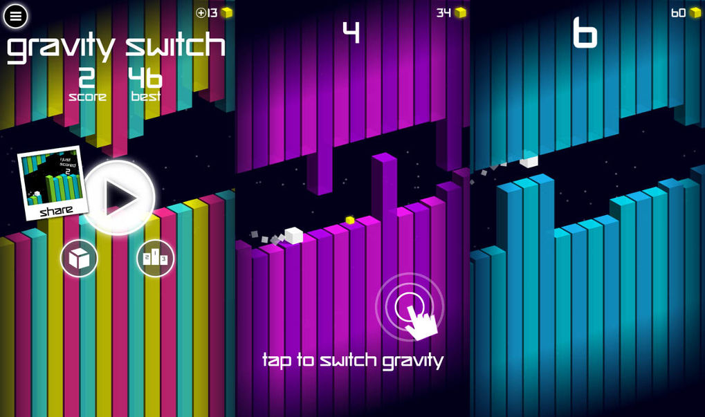 ประเภท : Arcade เกมฝึกสมาธิที่รับรองเลยว่า ถ้าคุณวอกแวกแม้แต่สักนิดล่ะก็ Game Over แน่นอน กับ Gravity Switch เกมที่จะให้เราควบคุมเจ้ากล่องไปตามฉาก ซึ่งการควบคุมก็ไม่ได้ยากอะไร เพียงสัมผัสที่จอเพื่อเปลี่ยนตำแหน่งของกล่องนี้เท่านั้นเอง เพียงแต่ว่าห้ามให้กล่องชนกับอะไรเป็นอันขาด หรือหากเราเคลื่อนที่ไปยังหลุมล่ะก็จะตกลงไปทันที ดังนั้นการเล่นจึงต้องใช้สมาธิเป็นอย่างมากเลยล่ะครับ