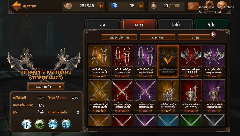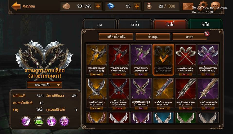 ด้วยอาวุธเหล่านี้จะสามารถเพิ่มความแข็งแกร่งให้กับผู้สวมใส่อีกทั้งมีสกิลพิเศษตัวอย่างเช่น ขวานคู่กระหายเลือดที่สามารถเพิ่มพลังการทำลายล้าง พิเศษสุด!ผู้เล่นสามารถได้รับอาวุธเหล่านี้ได้ผ่านระบบกาชาร์ที่ร้านค้าโดยตั๋วอาวุธระดับสูงกว่าวีรชน หรือมีโอกาสได้จากการผสมอุปกรณ์ที่ระดับสูงกว่าวีรชนขึ้นไป !!