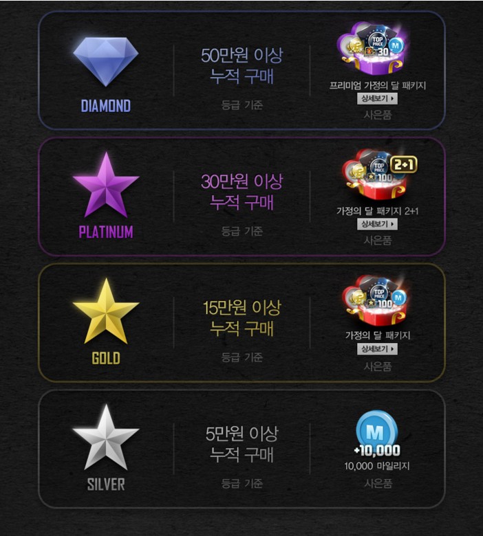 >> ระดับ Gold VIP สำหรับผู้เล่นที่มียอดซื้อสะสม 150,000 วอน ขึ้นไป Family package