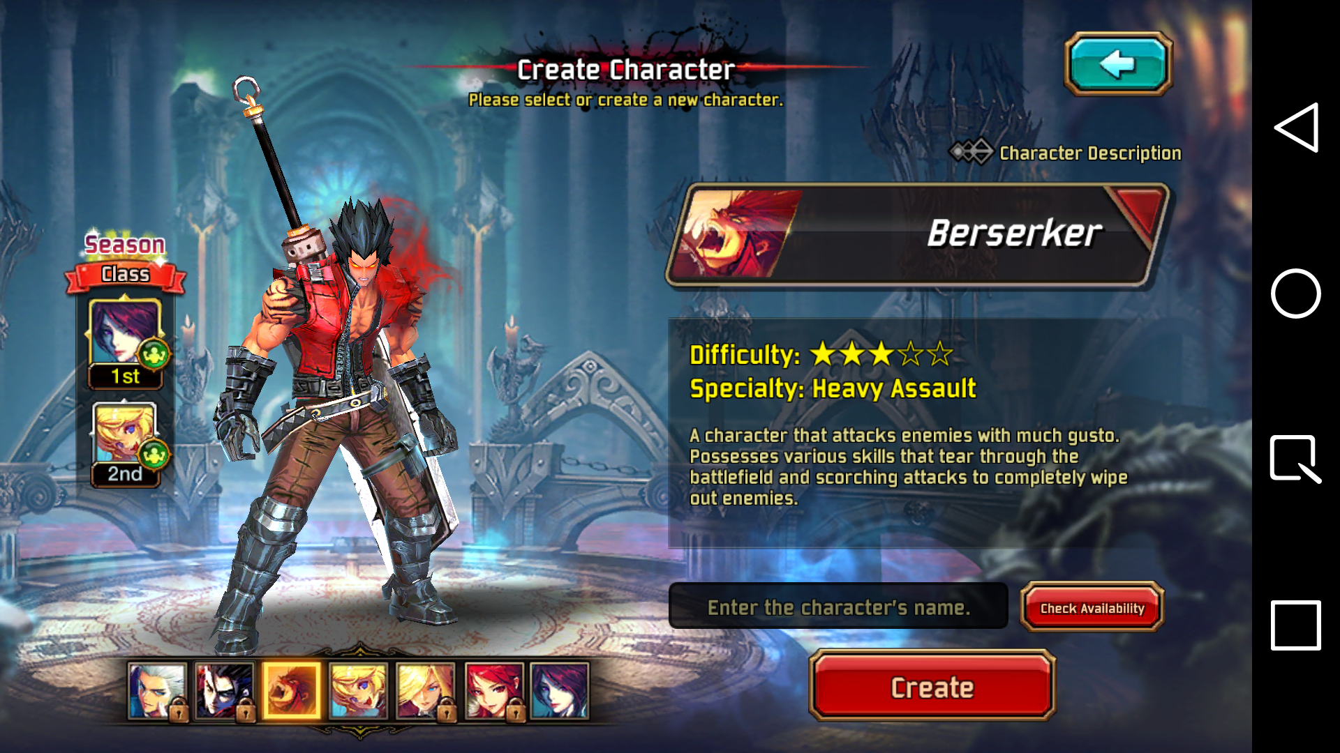 ในเกมนี้จะมีตัวละครหลายตัวให้เลือกใช้ ซึ่งในตอนแรกจะมีเพียง Berserker สายอึดลุยหนัก