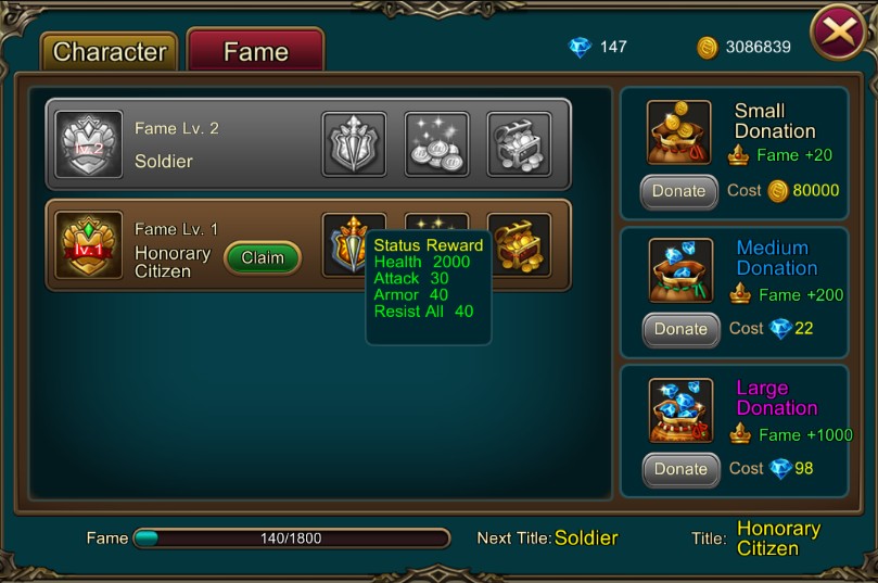 ส่วนนี้คือการบริจาคค่าชื่อเสียงเพื่ออัพยศของเรา(บริจาคได้วันละครั้ง) โดยเมื่ออัพยศแล้วเราจะได้ ของรางวัลต่างๆเช่น ค่าสเตตัสต่างๆ โดยจะเพิ่มติดตัวเราเลย ,เงินจำนวนหนึ่ง และ Spirit