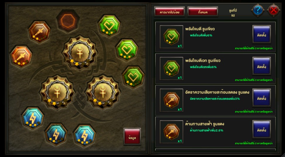 ในส่วนนี้คือรายละเอียดรูน เราสามารถกดดูได้ว่า เราใส่ออฟชั่นรูนอะไรอยู่บ้าง ซึ่งเกมจะรวมเปอร์เซ็นออฟชั่นที่ใส่มาให้เลย