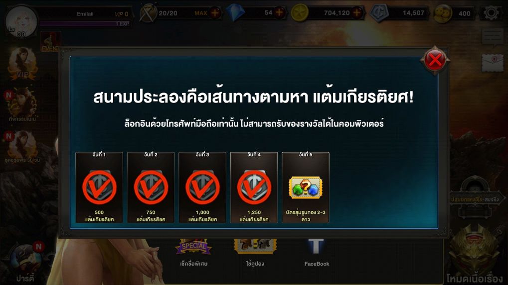 • ชั้น 5 = รางวัลสำเร็จ(ผ่านครั้งแรก) แต้มเกียรติยศ 100 แต้ม หากลงซ้ำครั้งต่อไปจะได้ครั้งละ 25 แต้ม