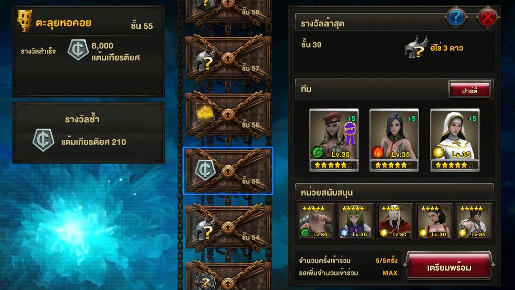 • ชั้น 55 = รางวัลสำเร็จ(ผ่านครั้งแรก) แต้มเกียรติยศ 8,000 แต้ม หากลงซ้ำครั้งต่อไปจะได้ครั้งละ 210 แต้ม