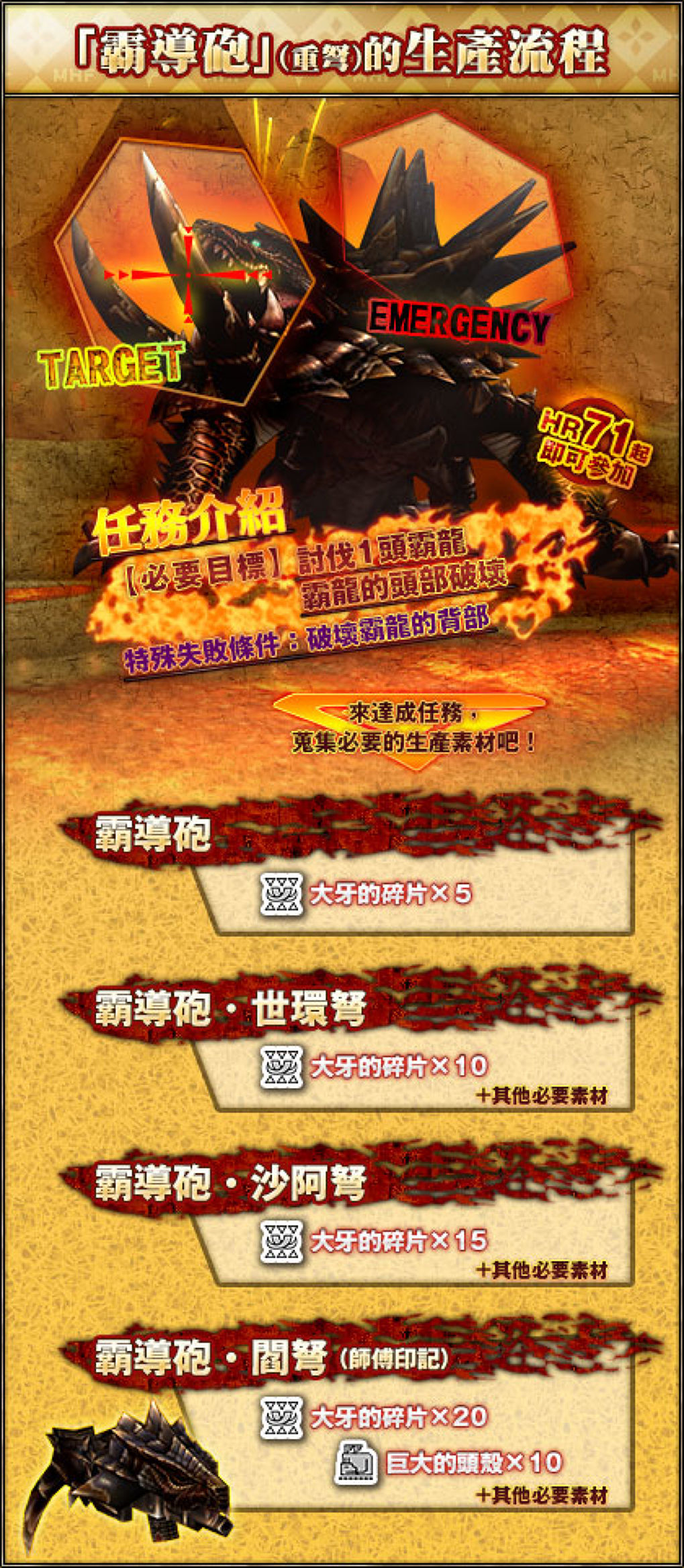 - เควส 「霸道」 HR/SR71 เงื่อนไขคือทำลายเขี้ยวอาคันทอ และฆ่าอาคันทอ แต่อย่าไปทำลายหลังอาคันทอล่ะครับ เพราะเควสจะเฟลทันที เมื่อจบเควสจะได้ไอเทมมาสร้างอาวุธ