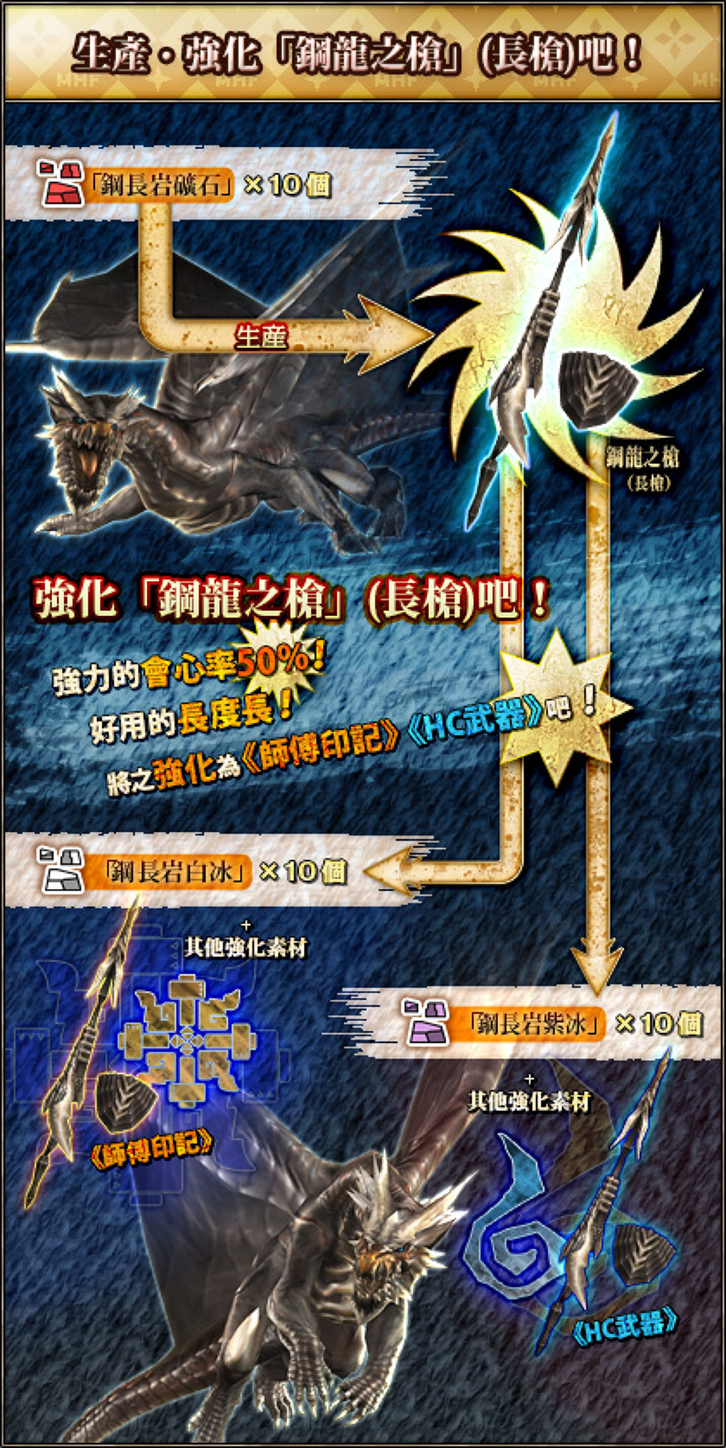 กิจกรรม Event Quest สร้างหอกและปืนใหญ่มังกรลมคูชาลดาโอร่า สำหรับหอกนั้นเป็นหอกแบบยาวธาตุน้ำแข็ง ส่วนปืนใหญ่นั้นสามารถยิงกระสุนน้ำแข็งได้อีกด้วย อาวุธทั้งสองชิ้นนี้สามารถอัพเกรดขึ้นระดับ G ได้ เป็นอาวุธที่ควรสร้างมาใช้เป็นอย่างยิ่ง