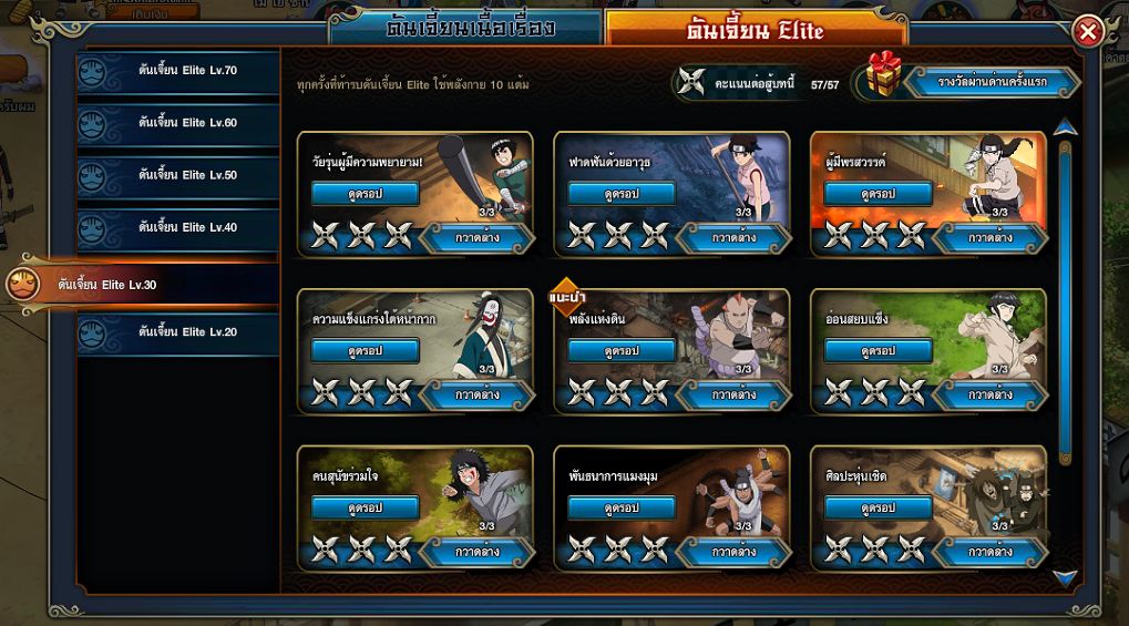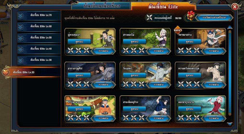 ดันเจี้ยน Elite เลเวล 30 : มีทั้งหมด 19 ด่าน ในที่นี้แนะนำด่านสำหรับเก็บเศษนินจาคือ