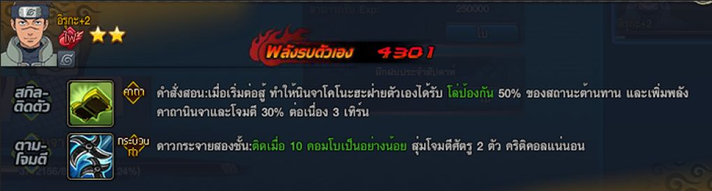 • ท่วงท่าไร้เทียมทาน : เพิ่มพลังโจมตีอย่างมากเมื่อนินจามี HP เต็ม (ในทีมควรมีนินจาสร้างเกราะป้องกัน เพื่อให้เพื่อนร่วมทีมไม่ได้รับความเสียหายจากการโจมตี)