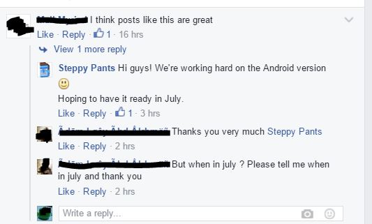 สำหรับตอนนี้เพื่อนๆชาว Android อย่าพึ่งน้อยใจกันไปเนอะ เพราะทีมงานเค้ากำลังพัฒนาอยู่ ตอนนี้เราก็ปล่อยให้เพื่อนๆ iOS เล่นกันไปก่อน อีกเดี๋ยวนึงรับรองว่าเพื่อนๆ Android จะได้เข้าไปเล่นกันได้แน่ๆ ตอนนี้หากใครอดทนไม่ไหวอยากเล่นม้ากกกมากล่ะก็  ขอแนะนำให้ไปปล้น iPhone หรือ Ipad เพื่อนข้างๆมาเล่นกันก่อนน้าาาา แต่ถ้าติดจนลืมคืนเพื่อนแล้วโดนโกรธอย่าหาว่ากบไม่เตือนนะ! ส่วนวันที่ตัวเกมเวอร์ชั่น Android จะออกนั้นทีมงานไม่ได้ออกมารับปาก แต่ได้แจ้งในแฟนเพจว่าน่าจะประมาณเดือนกรกฎาคมนี้จ้า