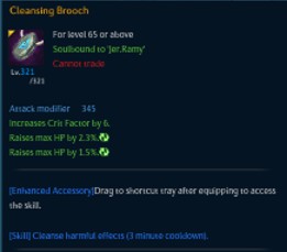 Brooch หรือ เข็มกลัด เป็นไอเทมจำเป็นอีกหนึ่งชิ้น ซึ่ง Support ต้องใช้เข็มกลัดที่สามารถล้างดีบัพได้ เผื่อฉุกเฉิน ติดดีบัพต่าง ๆ เช่น สตัน ใบ้ หลับ ที่เราไม่สามารถใช้สกิลอื่นในการแก้บัพตัวเอง เพราะฉะนั้นเข็มกลัดที่สามารถล้างดีบัพได้จึงสำคัญ อย่าง Cleansing Brooch(เข็มกลัดนี้หาไม่ได้แล้วนะเป็นแรร์) เป็นต้น และออพชั่นที่มักใช้กันคือ ออพชั่นเพิ่มเลือด (เราสามารถเอาเข็มกลัดมาใส่ในช่องคีย์ลัดได้)
