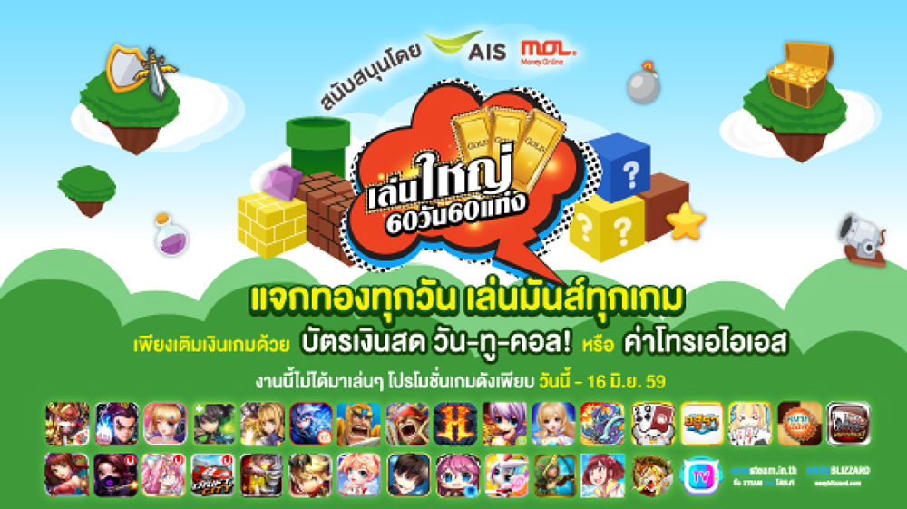 By AIS แจกทองคำทุกวัน 60 วัน 60 แท่ง โดยเริ่มมาตั้งแต่ 18 เม.ย.ที่ผ่านมา และเพื่อตอกย้ำกระแสความแรงค่ายเกมดังพร้อมใจกันจัด โปรดี ไอเทมโดนมาให้ผู้เล่นเป็นการส่งท้ายรีบหน่อยเพราะจะ