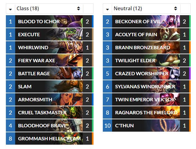 สำหรับ Warrior ในแพทช์นี้ยังคงซึ่งไว้ความ Control Deck เช่นเคย แม้ว่าตอนแรกที่คิดไว้ว่าการ์ด Warrior สาย Control โดนลดบทบาทลงมากใน Standard แม้ว่าเจอ Deck สายบัพ C'Thun เช่นกันยังแข็งแกร่งกว่าเนื่องจากการเกราะที่แน่หนา และ Grommash Hellscream ยังคงเป็นตัวสำคัญในการจบเกมเช่นเคย