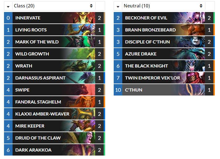 หลังจากหลายคนท้อแท้ของการโดนเนิร์ฟคอมโบไป แต่ทว่า Druid กลับกลายเป็น Deck เทพอีก Deck ที่หลายคนเจอกับ C'Thun Druid ที่เรียกได้ว่าทั้งเร็วและแข็งแกร่ง โดยนำ Decklist ของ Amaz มาอีกรอบ นอกจากเทพ C'Thun แล้ว Fandral Staghelm เป็นอีกใบโหดของ Druid ใน Meta นี้ที่ทำให้การ์ดเกือบทุกใบ คุ้มค่าร่ายอย่างมาก