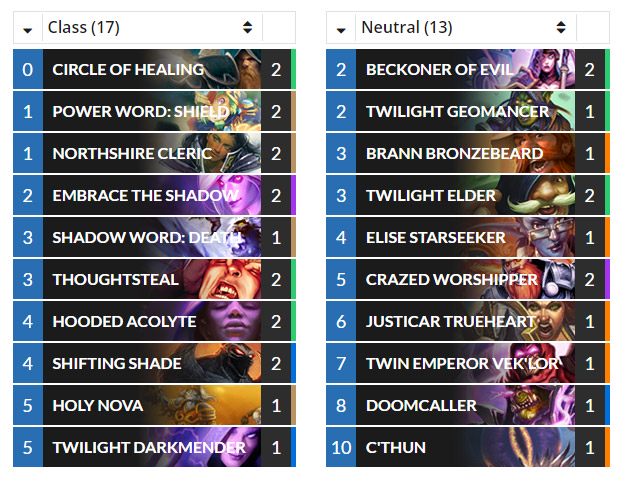 เป็น Deck Control เช่นเคย แถมยังมีการ์ดบัพ C'Thun โหดๆอย่าง Hooded Acolyte ที่ปั้มไวมากเพราะ +1/1 ให้ C'Thun ทุกการ Heal แถมไม่ต้องกลัว C'Thun ของศัตรูเพราะมีการ์ดทำลายดีๆอย่าง Shadow Word: Death อีก