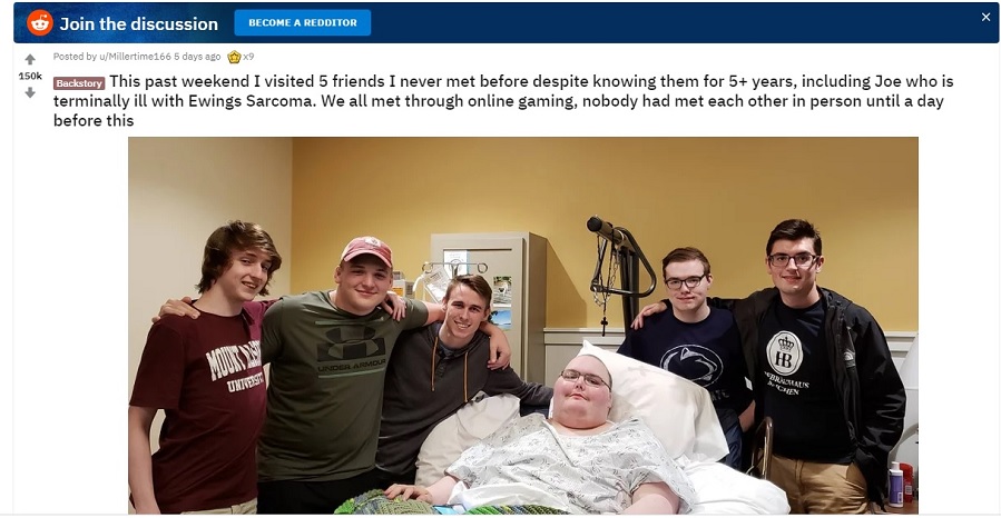 เด็กหนุ่มนามว่า Joe เขาอาศัยอยู่ในรัฐนิวเจอร์ซี่ย์ สหรัฐอเมริกา เป็นผู้ที่ป่วยเป็นมะเร็งกระดูกประเภท Ewing's sarcoma ระยะสุดท้าย ซึ่งเขาเหลือชีวิตอีกไม่มากนัก เขาได้มีเพื่อนที่เล่นเกมออนไลน์ที่สนิทกันมาก เล่นด้วยกันมาตั้ง 5 ปีพอได้ทราบข่าวนี้แล้ว ทางคุณ David Miller ซึ่งอาศัยอยู่ในประเทศแคนาดา ชักชวนเพื่อนมาเยี่ยม Joe ซึ่งเป็นการพบหน้ากันครั้งแรกและอาจจะเป็นครั้งสุดท้ายของเขาด้วย ซึ่งเรื่องราวและรูปภาพของเขาถูกถ่ายถอดลงในเว็บไซต์ Reddit