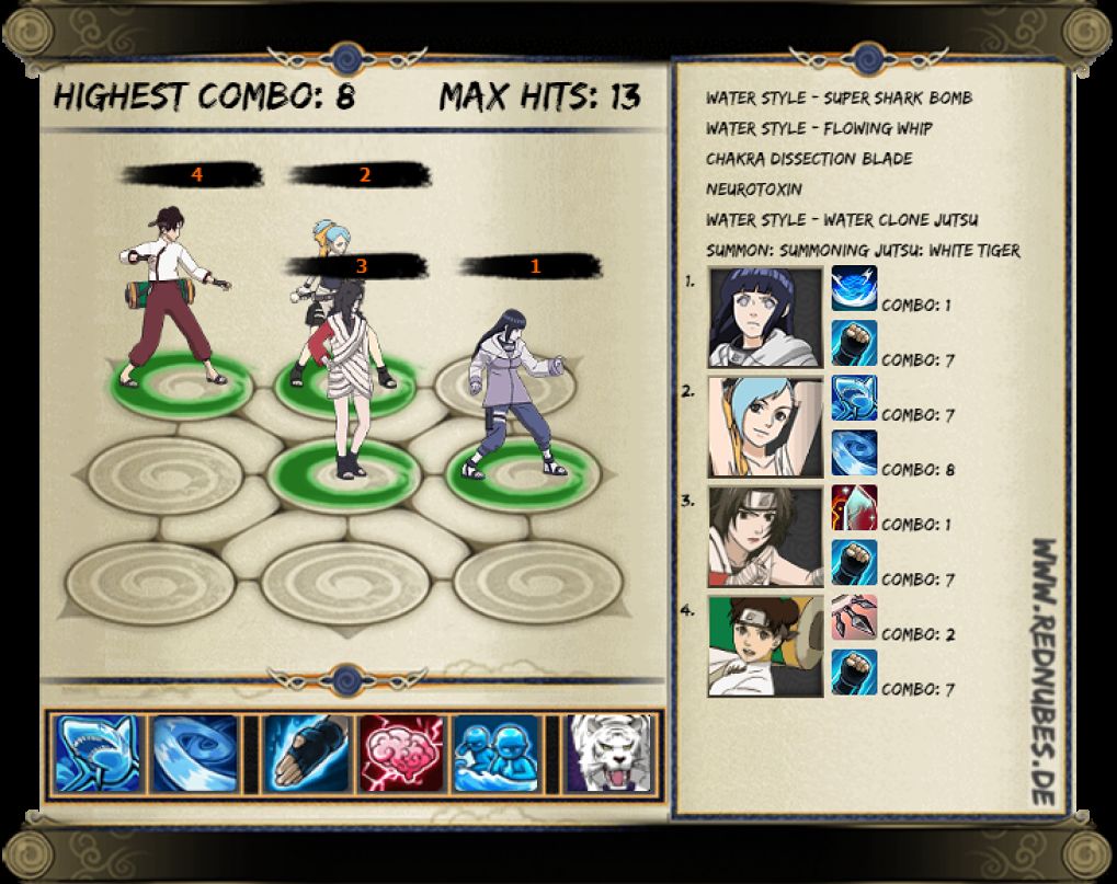 "ฮิวงะ ฮินาตะ" ทายาทหญิงแห่งตระกูลหลักของกลุ่มฮิวงะ และด้วยความสามารถของ "เนตรสีขาว" ที่สามารถมองทะลุไปถึงการไหลเวียนของเส้นจักระ และความสามารถของ "มวยอ่อน" ที่สามารถหยุดการไหลเวียนเส้นจักระนั้นทำให้ตระกูลนี้เป็นชั้นนำแห่งหมู่บ้านโคโนฮะมาจนถึงปัจจุบัน การใช้งานของฮินาตะนั้นเราจะหยิบนำเอามาใช้งานในฐานะของ Tanker ที่อยู่ในแถวหน้าและสามารถปัดป้องการโจมตีปกติได้ อีกทั้งความสามารถในการสกัดจุดของเธอนั้นก็สร้างความปั่นป่วนให้ศัตรูได้เป็นอย่างดี ซึ่งรายละเอียดคาถาในแต่ละร่างของเธอจะมีดังนี้![]()
