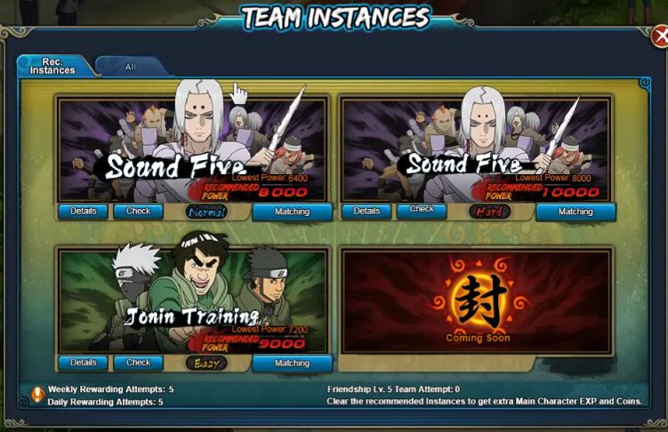 ในการเก็บเลเวลเกม Naruto Online นี้จะเน้นการลง Dungeons เป็นหลักซึ่งมีทั้งแบบเดี่ยวและแบบทีม สำหรับแบบทีมหรือ Team Instances นั้นจะเข้าได้เมื่อตัวละครเลเวล 30 ขึ้นไป สามารถลงได้สูงสุด 3 คน ซึ่งในโหมด Team Instances เป็นเหมือนกับกิจกรรมอย่างนึงที่สามารถทำได้ทุกวันตามเวลาที่ทางเซิร์ฟเวอร์กำหนด ของรางวัลนั้นไอเทมพิเศษที่ไม่สามารถหาได้จากดันเจี้ยนแบบเดี่ยว และหากพูดถึงความยากของการลงดันเจี้ยนแบบทีมนี้แล้วบอกได้เลยว่าต้องใช้ความสามัคคีกันพอสมควรเลยแหละ ที่ขาดไม่ได้ในทีมเวลาลงดันเจี้ยนแบบทีมนี้ต้องเป็นตัวละครที่มีความสามารถในการหยุดสกิลของศัตรูได้จะทำให้การลงดันเจี้ยนราบรื่นขึ้นเยอะ
