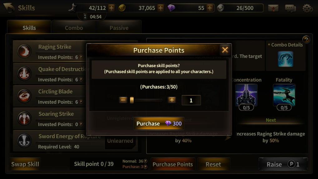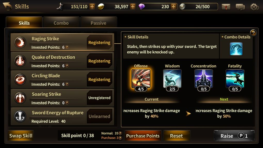 ล้มแต่ละค่าก็จะแบ่งการอัพเกรดออกไปอีก 4 แบบคล้ายๆ Active Skill คือOffense เพิ่มความรุนแรงในการใช้สกิลนั้นWisdom ลดคูลดาวน์ในการใช้สกิลนั้นConcentration เพิ่มค่าคริติคอลเรตให้กับสกิลนั้นFatality เพิ่มค่าคริติคอลดัมเมจให้กับสกิลนั้นรูปแบบการอัพก็จะเป็นแบบเดียวกัน สมนุมิว่าเราอัพ Comboล้ม เต็ม 20 แต้มเมื่อเป้าหมายติดสถานะนี้แล้วเราโจมตีไป รับรองว่าโดนดัมเมจไปเต็มๆ แต่ก็ต้องแลกดับสกิลอื่นที่จะลดค่าความเสียหายลงไปด้วย มาถึงสกิลสุดท้ายคือ Passive Skill หรือสกิลติดตัวที่ไม่ต้องกดใช้เป็นสกิลที่จะมีผลเมื่อเราโจมตีแบบธรรมดา แบ่งออกเป็น 3 หมวดหลักได้แก่ - Attack แบ่งเป็น 4 สกิลคือOffense เพิ่มดัมเมจจากการโจมตีธรรมดา เพิ่มขึ้นเรื่อยๆ ตามระดับของสกิลที่อัพ Destruction เพิ่มพลังโจมตีในการประลอง PVP เพิ่มขึ้นเรื่อยๆ ตามระดับของสกิลที่อัพ Concentration เพิ่มค่าคริติคอลเรต ขึ้นเรื่อยๆ ตามระดับของสกิลที่อัพ Fatality เพิ่มพลังการโจมตีเมื่อติดคริติคอล ขึ้นเรื่อยๆ ตามระดับของสกิลที่อัพ Defense เพิ่งพลังป้องกันให้ตัวละคร ขึ้นเรื่อยๆ ตามระดับของสกิลที่อัพ Blocking ลดค่าความเสียหายที่เกิดขึ้นในการต่อสู้ PVP Meditation เพิ่มค่า MAX HP ให้ตัวละครResistance ลดระยะเวลาการผิดสถานะต่างๆ ทั้ง ลอย มึน ล้ม Vengeance เพิ่มค่าความเสียหายจากการโจมตีสวนกลับRevival ฟื้นเลือดให้เป็น % ทุกครั้งจากการโจมตีสวนกลับHatred เพิ่มค่าคริติคอลเรตในการโจมตีสวนกลับPunishment เพิ่มค่าความเสียหายของการโจมตีคริติคอล จากการโจมตีสวนกลับ ข้อแนะนำในการอัพสกิลนั้นคงไม่มีอะไรมาก อย่างแรกคงต้องดูในส่วนของแต้มสกิลก่อนว่ามีมากหรือน้อย และการได้แต้มสกิล นั้นคือจะได้ 1 แต้มหลังจากการอัพเลเวลตัวละคร 1 เลเวล ดังนั้นจึงต้องคำนวณไปด้วย แต่ทางลัดสำหรับผู้ที่อยากได้แต้มสกิลเพิ่มก็สามารถซื้อได้ราคา 300 เพชรที่ได้จากการแจก หรือเติมซื้อนั่นแหละครับ ต่อมาคือเรื่องของ แนวทางการเล่นของแต่ละคน ถ้าชอบเก็บเลเวลแบบสันติก็อาจจะเน้นไปเรื่องของ Active Skill เป็นหลักและอัพ Passive ติดตัวประเภท โจมตี ป้องกัน คริติคอลบ้าง แต่ถ้าชอบแนว PVP แล้วละก็การลดคลูดาวน์ของสกิลนั้นถือเป็นเรื่องที่ต้องทำเป็นอย่างมาก เพราะยิ่งออกสกิลได้ถี่เท่าไหร่ย่อมได้เปรียบคู่ต่อสู้ รวมถึงค่าลดพลังการโจมตี และเพิ่มพลังการโจมตีในโหมด PVP ก็ถือว่าดีมากๆ ครับ แต่เกมนี้มีข้อดีอย่างหนึ่งนั่นคือเราสามารถ Reset Skill ได้เองตลอดเวลา แค่จ่ายเงินในเกมนิดหน่อยก็สามารถรีแต้มทุกอย่างแล้วอัพใหม่ได้ ดังนั้นเกมนี้จึงทำให้ผู้เล่นปรับเปลี่ยนรูปแบบของสกิลได้ตามสถานการณ์ที่ใช้ได้อยุ่ตลอดเวลา ส่วนใครที่ถามว่าสายผมต้องอั