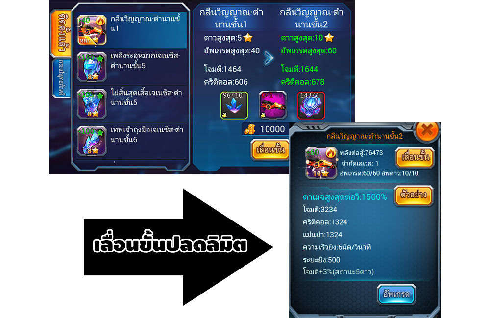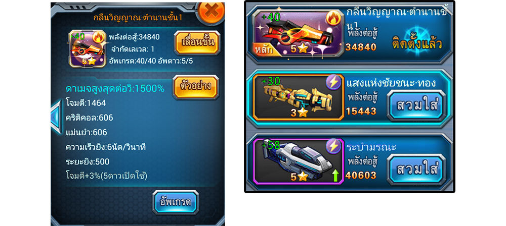 ► "ปืนแสงแห่งชัยชนะ(VIP1)" อัพเกรด30 จะเบากว่า "ปืนผู้ทำลายล้าง(1200P)" อัพเกรด40 ประมาณ1ดาว