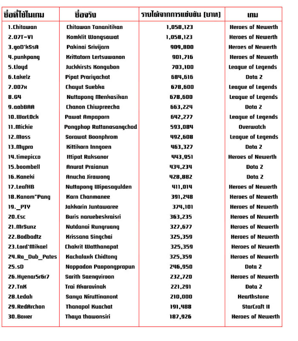 30 อันดับเกมเมอร์ชาวไทยรายได้สูงสุด