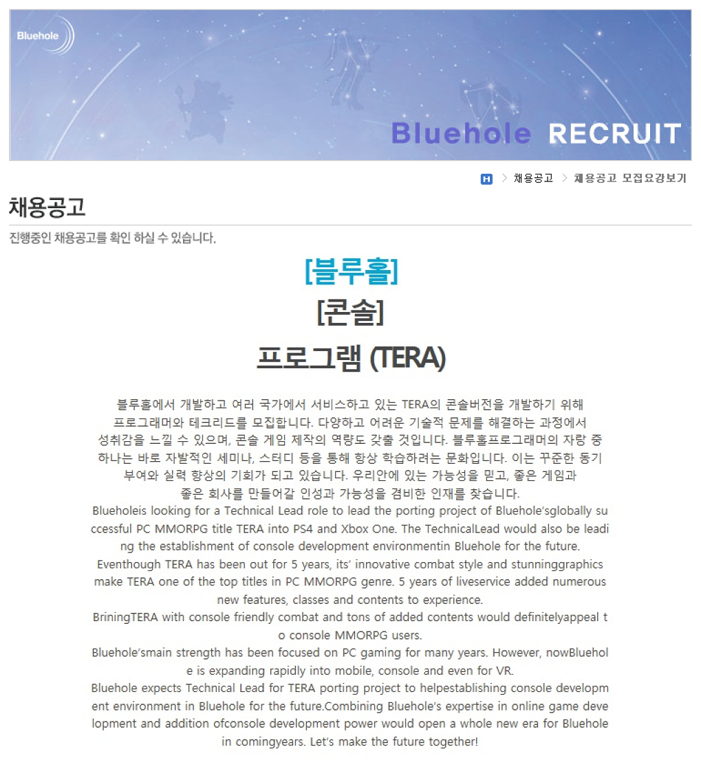 ข่าวนี้ถูกเผยออกมาตั้งแต่วันที่ 30 เมษายนที่ผ่านมา เมื่อ Bluehole Studio ได้ประกาศเปิดรับสมัครนักออกแบบ UI และโปรแกรมเมอร์ผู้ที่จะมาพัฒนาเกม TERA ใหม่บนแพลตฟอร์มคอนโซลที่จะต้องมีประสบการณ์ในการพัฒนาเกมมาแล้ว 2 ปีเป็นต้นไป ส่วนหัวหน้าโปรแกรมเมอร์ก็ต้องมีประสบการณ์ 5 ปีขึ้นไปอีกด้วย โดยเวอร์ชั่นคอนโซลนี้ถือเป็นตัวเกมที่ใช้เจาะตลาดฝั่งประเทศอเมริกาเหนือและยุโรปโดยเฉพาะ นอกจากนี้ทางค่ายยังมีแง้มๆ อีกว่าจะมีเกม TERA เวอร์ชั่นมือถือ และ VR ก็อาจจะมีมาให้ได้เล่นเช่นกัน !!