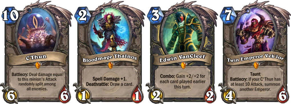ตัวคอมโบกับเจ้า C'Thun ที่เรียกได้ว่าไม่อยากเจอมันที่สุด กับโจมตี 4 ที่หลบการ์ดรีมูฟของ Priest ได้ ป้องกัน 6 ที่ต้องเสีย Fireball สักใบเพื่อทำลายมัน ทวีความรำคาญด้วยการเจอ 2 ตัว เพียงแค่ร่าย 7 สร้างความท้อใจให้กับ Aggro ยอดฮิตได้แน่นอน