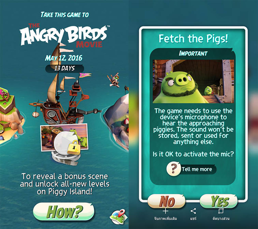2. เข้าไปที่หน้าเลือกแผนที่ แล้วเลื่อนไปที่ The Angry Birds Movie และจิ้มไปที่ How ? ให้กด Next และ ตามด้วย Yes รวมไปถึงอนุญาติให้ Angry birds Action เข้าถึงการบันทึกเสียง
