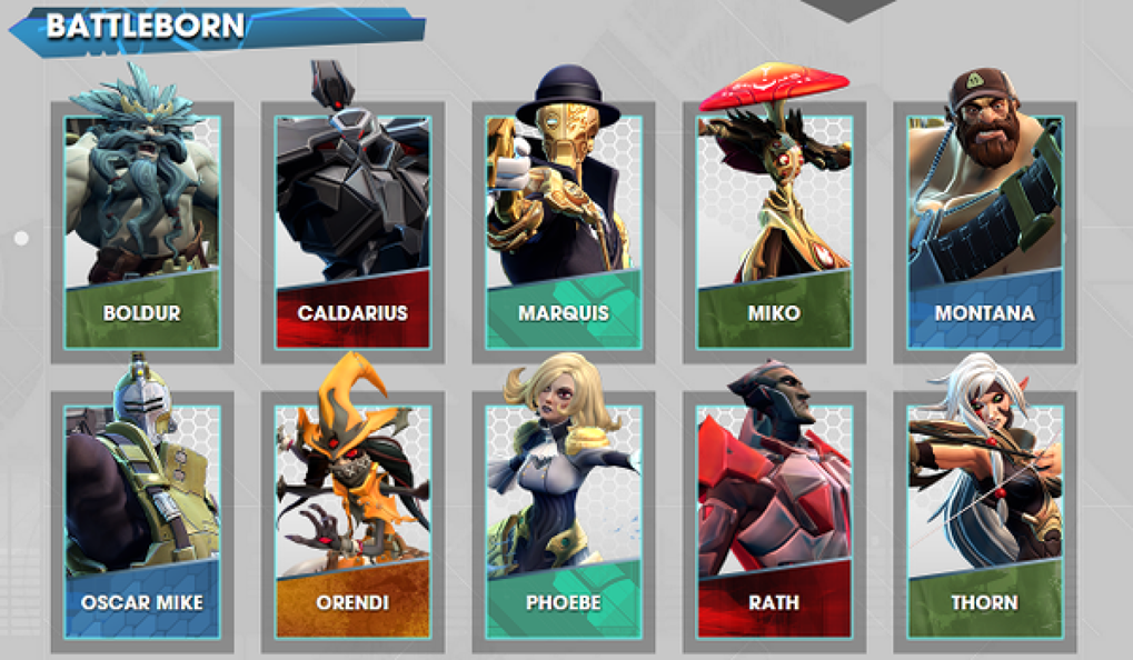 **Heroes - ของเกม Battleborn มีทั้งหมด 25 ตัวละคร ใน Open Beta เราจะได้เล่นตัวละครเพียงแค่ 7 ตัว ส่วนตัวละครอื่น จะปลดล๊อคทีหลัง เมื่อตอนที่ Rank Up และ ตำแหน่งของแต่ละตัวละครก็จะมีสามตำแหน่ง นั่นคือ Attackers,Defenders และ Supporters