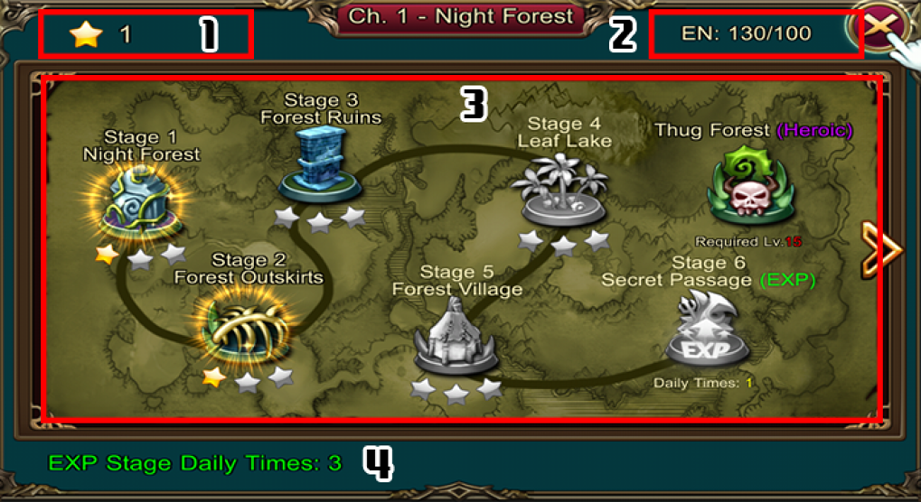 ในแผนที่เราจะต้องเลือกด่านต่างๆเพื่อออกผจญภัยโดยในแต่ละฉากจะมีให้เลือก 3 ระดับคือ Easy,Normal,Hard หในการลงดันเจี้ยนแต่ละครั้งจะต้องใช้ Energy (EN) หากเราสามารถผ่านได้ระดับ S ล่ะก็จะได้รับกล่องเป็นของรางวัลด้วย