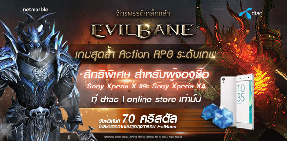 เกมสุดล้ำ Action RPG ระดับเทพ โดยมอบสิทธิพิเศษเฉพาะ สำหรับผู้จองซื้อ Sony Xperia X และ Sony Xperia XA ที่ DTAC l Online Store ระหว่างวันที่ 9 – 16 มิถุนายนนี้เท่านั้น! รับไอเทมฟรีในเกม EvilBane จำนวน 70 คริสตัล ทันที! ไอเทมโค้ดมีจำนวนจำกัด หมดแล้วหมดเลย แล้วอย่าลืม! เข้าไประเบิดความมันส์กันในเกม EvilBane กันต่อ!
