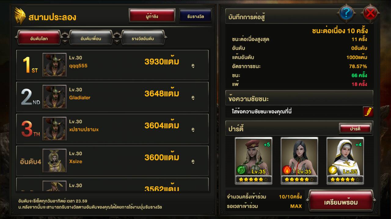 ต่อจากเข้าหุบเขาพิคูนกันไปแล้วก็มาต่อกันที่ "สนามประลอง" เมื่อเข้าเกมทุกครั้งก็ควรจะเข้ามาเล่นโหมดนี้ให้ "จำนวนครั้งเข้าร่วม" หมดไปซะ แล้วรอเวลารีให้เต็มแล้วค่อยมาเข้าต่อ ซึ่ง "จำนวนครั้งเข้าร่วม" จะรี 1 ครั้งใช้เวลา 30 นาที รวม 10 ครั้งก็ 300 นาที หรือก็คือรอไปยาวๆ 5 ชั่วโมงนั่นเองครับ แล้วก็กลับเข้ามาในเกมใหม่เมื่อถึงในตอนนั้น