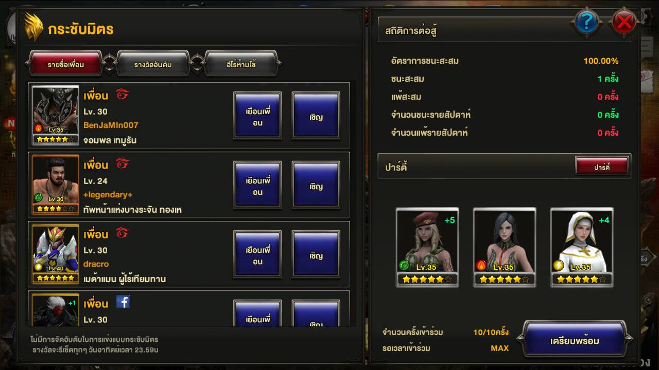 โหมดกระชับมิตร โหมดมันส์ๆ บันเทิงเริงรมย์ นี่ก็เป็นอีกโหมดที่เพื่อนๆต้องเข้ามาบ่อยๆ เมื่อเจ้าจำนวนครั้งมันเต็ม เพราะนอกจากจะเพื่อของรางวัลที่จะได้แล้ว ยังเพื่อความมันส์ด้วย ที่ให้เข้ามาบ่อยๆเพราะอะไร เพราะว่าโหมดนี้เป็นโหมดที่เราจะต้องเจอกับผู้เล่นด้วยกันที่ออนไลน์เกมอยู่นั่นเอง เรียกว่าต่อสู้กันแบบซึ่งๆหน้า เรียลไทม์กันเลย คราวนี้ก็จะไม่มีข้ออ้างเรื่อง AI โง่ล่ะ เพราะแพ้หรือชนะอยู่ที่ฮีโร่ในทีมเฟ้ย!! ในการเข้าร่วมต่อสู้ระบบเกมจะจับคู่ให้ ซึ่งก็ต้องมาลุ้นกันอีกทีว่า ตูจะเจอคนโหดๆ หรือจะได้ตบพวกอ่อนๆฟะ!