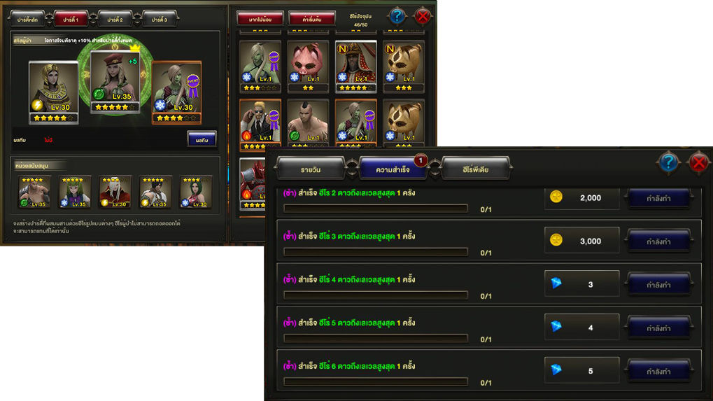 พลังงานเหลือเฟือครับผม ทำไรดี มานี่ซิไอหนุ่ม!! ถ้าหากคุณทำเควสสะสมฮีโร่ด้านบนไปแล้วหรือยังทำไม่สำเร็จก็ตาม แต่คุณก็สามารถทำเควสนี้ไปได้ด้วย นั่นก็คือ เควสเก็บเลเวลฮีโร่ให้เวลเต็มก็รับไปเลยเพชรและทอง จำนวนหนึ่งจ้า เควสนี้สามารถทำควบคู่ไปกับเควสอย่างอื่นได้ เพียงขอให้มีตัวหลักที่โหดพอ เก่งพอ ที่จะยืนถึกพร้อมทำดาเมจไปด้วยได้แบบไม่ตาย แล้วให้เรานำตัวเด็กที่เลเวลยังไม่เต็ม Max มาวางไว้ในช่อง 2 และ 3 เพียงแค่นี้ก็ตะลุยด่านไปครับ เน้นด่านที่คิดว่าให้ exp มากที่สุดและเก็บเลเวลตัวเด็กไวที่สุด