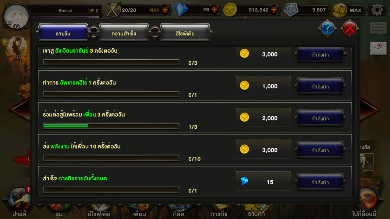ทำเควสประจำวันด้วยนะครับทุกท่าน อย่าลืมม... เพราะนอกจากมันจะทำง้ายง่าย ได้เงินได้ทองให้มาใช้สอยสะสมทุกๆวันแล้ว เมื่อสำเร็จทุกเควสก็จะได้รับเพชรไปใช้ 15 เม็ดฟรีๆอีกด้วยครับ เพราะฉะนั้นคุณๆทั้งหลาย จงไม่พลาดตรงนี้นะครับผม...