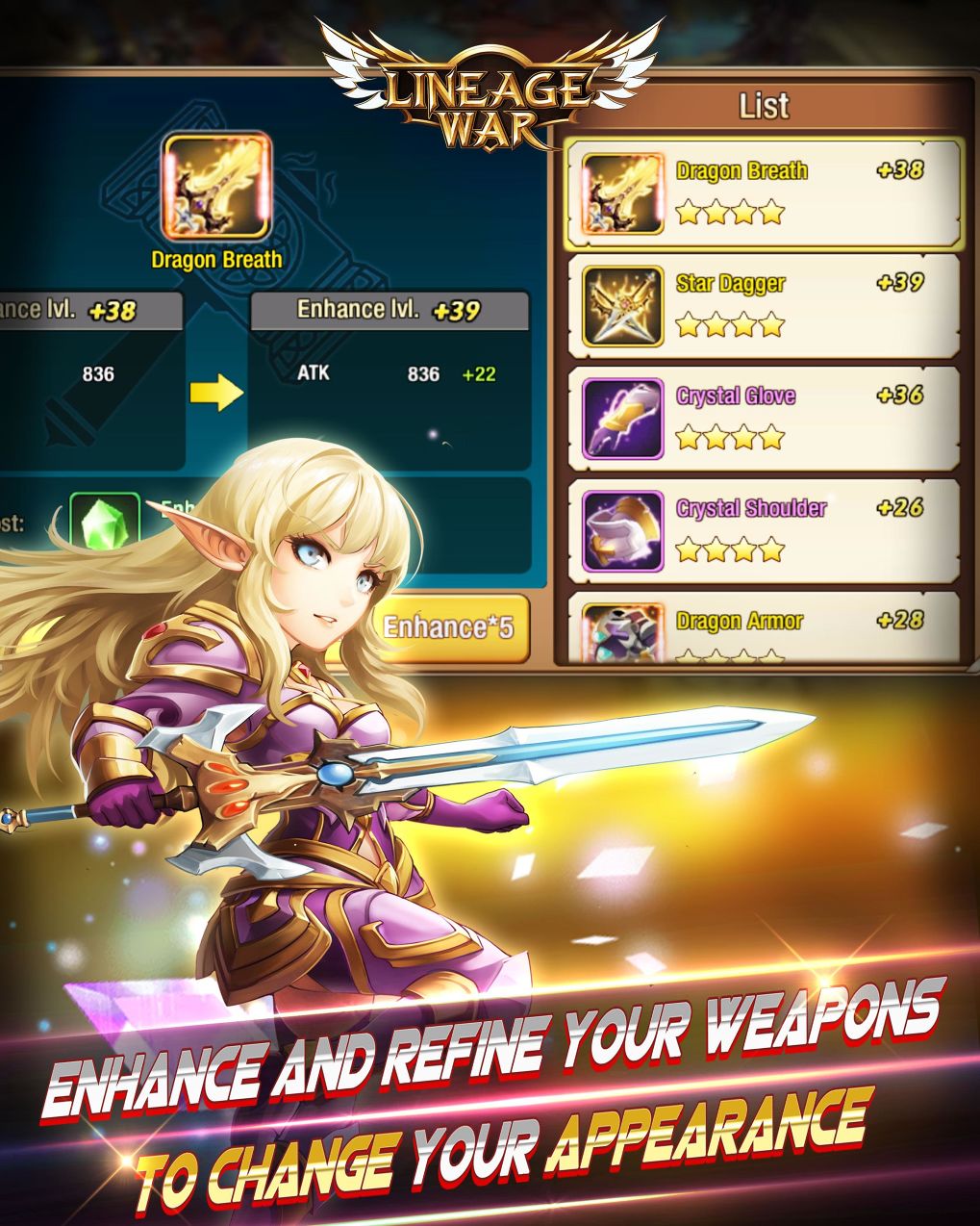 ► ระบบแปลงร่างและ การโจมตีแบบ QTE : ตัวละครของผู้เล่นจะสามารถเก็บเกจในการต่อสู้เพื่อแปลงร่างตัวเองให้เป็นเทวทูตหรือจอมมาร ได้ ซึ่งจะปลดล็อคการโจมตีแบบ QTE ที่มีความรุนแรงสูงออกมาอีกด้วย นอกจากนั้นร่างแปลงร่างยังสามารถอัพเกรดได้จากการหาวัตถุดิบมาอัพเกรดซึ่งสามารถหาได้จากในดันเจี้ยนและอารีน่า► ระบบทหารรับจ้างและระบบธาตุ : ระบบทหารรับจ้างผู้เล่นสามารถเปิดกล่องสมบัตเพื่อลุ้นทหารรับจ้างสุดแข็งแกร่งที่จะเข้าร่วมผจญภัยกับผู้เล่น ซึ่งทหารรับจ้างก็จะมีธาตุประจำตัว ลม, ไฟ, น้ำ อย่างใดอย่างหนึ่ง ซึ่งสกิลของผู้เล่นก็เช่นกัน ซึ่งผู้เล่นต้องเลือกพวกเค้าให้เหมาะสมกับการผจญภัยหรือสู้กันกับบอส เพื่อให้ความได้เปรียบเรื่องธาตุทำให้การปราบบอสง่ายขึ่้่น► ระบบสร้างอาวุธและดันเจี้ยนประเภท Abyss : ตัวเกมเปิดโอกาศให้ผู้เล่นได้สร้างอาวุธที่มีมากกว่า 100 ชนิดในเกมได้อย่างอิสระ และระบบดันเจี้ยน Abyss ซึ่งผู้เล่นต้องเข้าร่วมกับผู้เล่นอื่นอีกสองคน เพื่อเข้าสู่กับบอส ซึ่งสามารถสู้ได้ทีละคน และมีโอกาศได้รับไอเท็มหายากด้วย ซึ่งสามารถลงได้วันละ 3 ครั้งเท่านั้นนี่เป็นเพียงส่วนหนึ่งใน Lineage War เท่านั้นถ้าอยากรู้ว่าตัวเกมมีความสนุกจนสามารถก้าวขึ้นมาในกลุุ่มเกมที่ทำเงินได้มากที่สุด ในหลาย Store ที่เปิดให้บริการ ต้องดาวน์โหลดมาเล่นเลยครับสำหรับ Lineage War !!