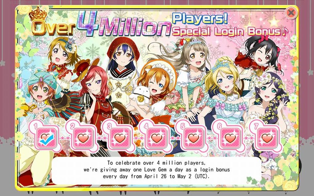 ในส่วนของการฉลองยอดรวมผู้เล่นในเซิร์ฟเวอร์อินเตอร์เกิน 4 ล้านคนในครั้งนี้ทาง KLab จะทำการเเจก Love Gem ให้กับผู้ที่ล็อคอินเข้าเกมตั้งเเต่วันที่ 26 เมษายน ถึง 2 พฤษภาคม โดยจะเเจกวันละหนึ่งก้อน รวมทั้งสิ้น 7 ก้อนด้วยกัน(ถ้าเเจกเยอะกว่านี้ถือว่าผิดปกติของ KLab ครับ ฮา)