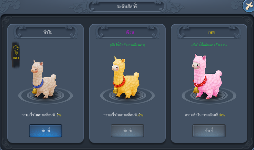 4. ระดับสัตว์ขี่ – ดูรายระเอียดการพัฒนาของสัตว์ขี่ สัตว์ขี่แบ่งได้เป็น 3 ระดับ 1.ทั่วไป 2.เซียน 3.เทพ