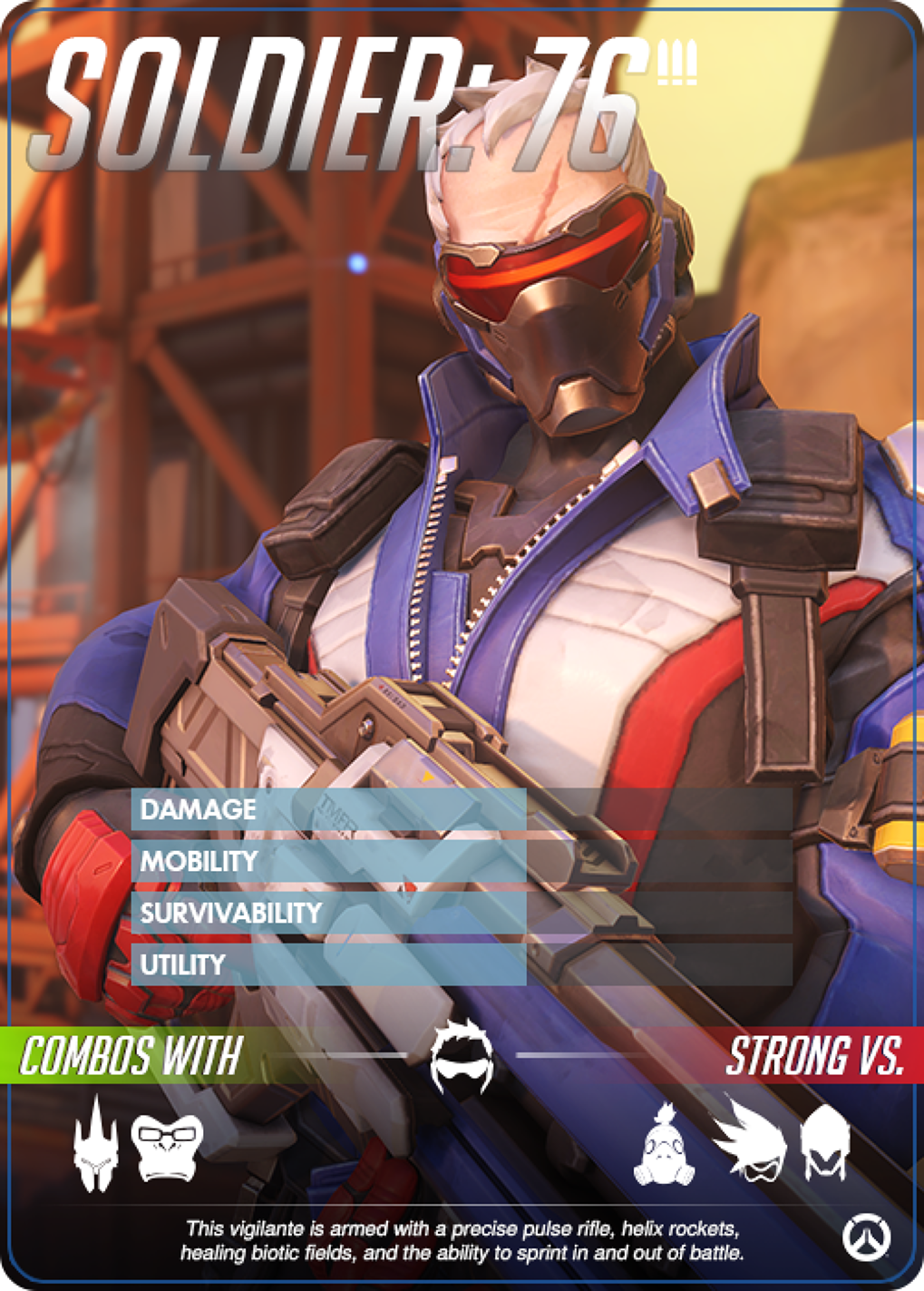 การรับมือนั้นไม่ยากและไม่ง่าย โดยมากแล้วหากภายในทีมของเรามีตัวละคร Offense เพียงพอหรือมีการคุ้มกันแผงหลังที่ดี Reaper จะเข้ามาหาผู้เล่นในทีมเราค่อนข้างลำบาก จุดสำคัญคือให้พยามเช็คในจุดอับอยู่เสมอๆ เพราะผู้เล่น Reaper ทีเก่งๆ มักจะหาช่องเล็ดลอดเข้ามาหาเราได้ตลอด และถ้าหากว่าทีมของเราโดน Reaper เข้ามาล้วงแผงหลังบ่อยๆล่ะก็ การเลือกตัวละครอย่าง McCree มาระวังแนวหลังให้เพื่อนก็เป็นตัวเลือกที่ไม่เลวครับ เพราะ McCree สามารถยัดระเบิดสตั้นแล้วเอากระสุนยัดใส่ Reaper ให้ตายได้อย่างง่ายๆ และอีกตัวนึงที่สามารถรับมือกับ Reaper ได้ดีคือ Pharah เพราะเธอสามารถที่จะกระโดดหลบและยิงจู่โจมจากที่ค่อนข้างห่างจากระยะโจมตีของ Reaper ได้ง่ายๆ ด้วยการบินของเธอ นอกจากนี้เธอยังมีสกิล E ที่ทำให้ เธอทิ้งระยะห่างได้ด้วย Soilder 76 เป็นฮีโร่ที่สมดุลทั้งรุกและรับ เขาสามารถสู้กับศัตรูได้ทุกระยะ ทำให้สามารถปรับตัวไปตามสถานการณ์ต่างๆได้ดี นอกจากนี้ตัวเค้าเองยังสามารถฮีลให้เพื่อนๆ ร่วมทีมได้อีกด้วย ถึงแม้ว่าจะไม่เด่นด้านใดด้านนึงเป็นพิเศษ แต่ด้วยความสามารถที่หลากหลายทำให้เค้าสามารถไปได้กับทุกทีมเลยทีเดียว ในการเล่นตัวละครนี้นั้นไม่ค่อยมีอะไรตายตัวสักเท่าไหร่เพราะเค้าสามารถทำหน้าที่ได้หลากอย่างมาก แต่ตัวเค้าเองจะไปได้ดีมากๆกับสายแท้งอย่าง Reinhardt โดยการหลบอยู่หลังเกราะและยิงจัดการกับศัตรูในจุดที่ปลอดภัยหลังโล่ป้องกัน ซึ่งมันจะเป็นการง่ายมากในการเก็บป้อมของศัตรูหรือทำความเสียหายให้กับศัตรูที่อยู่แนวหน้า โดยเฉพาะ Helix Rocket หากเรากะจังหวะใช้ให้ดีล่ะก็จะทำความเสียหายได้รุนแรงมากๆ นอกจากนี้เรายังสามารถช่วยฮีลให้กับเพื่อนๆด้วย Biotic Field ได้ด้วย ทำให้ทีมสามารถบุกตะลุยไปได้เรื่อยๆ ถึงแม้ว่าตัวละครนี้จะครอบคลุมทำได้ทุกอย่างก็จริง แต่ต้องอย่าลืมว่ามีตัวอื่นๆ ที่ทำหน้าที่ได้ดีกว่าเค้าอยู่เสมอ ดังนั้นหากว่าทีมเราขาดตัวฮีลจริงๆ ก็ควรหาคนเล่นตัวอื่นที่ฮีลได้จะดีกว่า หรือหากขาดดาเมจหนักๆ การจับตัวอื่นที่สามารถโจมตีได้อย่างหนักหน่วง ดูจะมีเหตุผลที่เข้าท่ากว่า*****Tip ปืนของ Soilder 76 นั้นสามารถยิงได้หลายระยะ แต่ในระยะที่ไกลมากๆจะทำดาเมจได้น้อยลงพอสมควรเลยทีเดียว และรูปแบบการยิงที่แม่นยำที่สุดในระยะกลางคือ ยิงทีละไม่เกิน 5 นัดเพราะหากมากกว่านี้เป้าจะเริ่มส่ายครับ