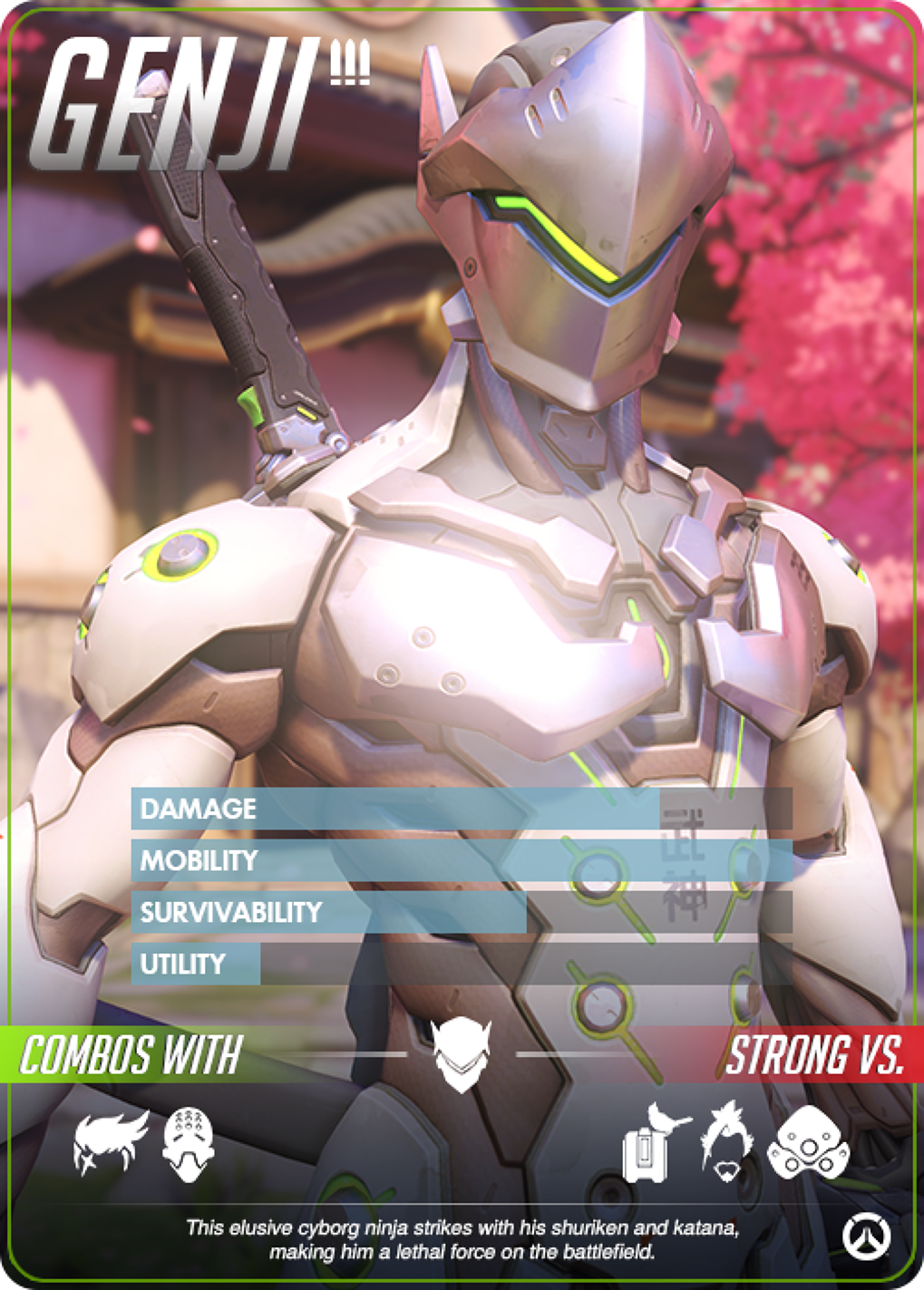 Genji เป็นตัวละครที่เคลื่อนที่ได้อย่างรวดเร็วและสามารถก่อกวนแนวหลังของศัตรูได้อย่างมีประสิทธิภาพ โดยเฉพาะเมื่อเค้ากำจัดเป้าหมายได้ จะทำให้สกิล Swift Strike ใช้งานต่อได้ทันที ซึ่งมันจะน่ากลัวมกาหากเค้ามีท่าไม้ตายอยู่ เพราะจะทำให้เค้าไล่เอาดาบฟันทีมคู่ต่อสู้หัวแบะไล่คนได้ภายในพริบตาเลยทีเดียวจากคอมโบฟันให้ตายแล้วใช้ Swift Strike ไปเรื่อยๆ นอกจากนี้เค้ายังสามารถสะท้อนดาเมจได้ด้วยสกิล Deflect ทำให้คนยิงมาตายเองมานักต่อนักกันเลยทีเดียว (โดยเฉพาะการใช้กับ Bastion)