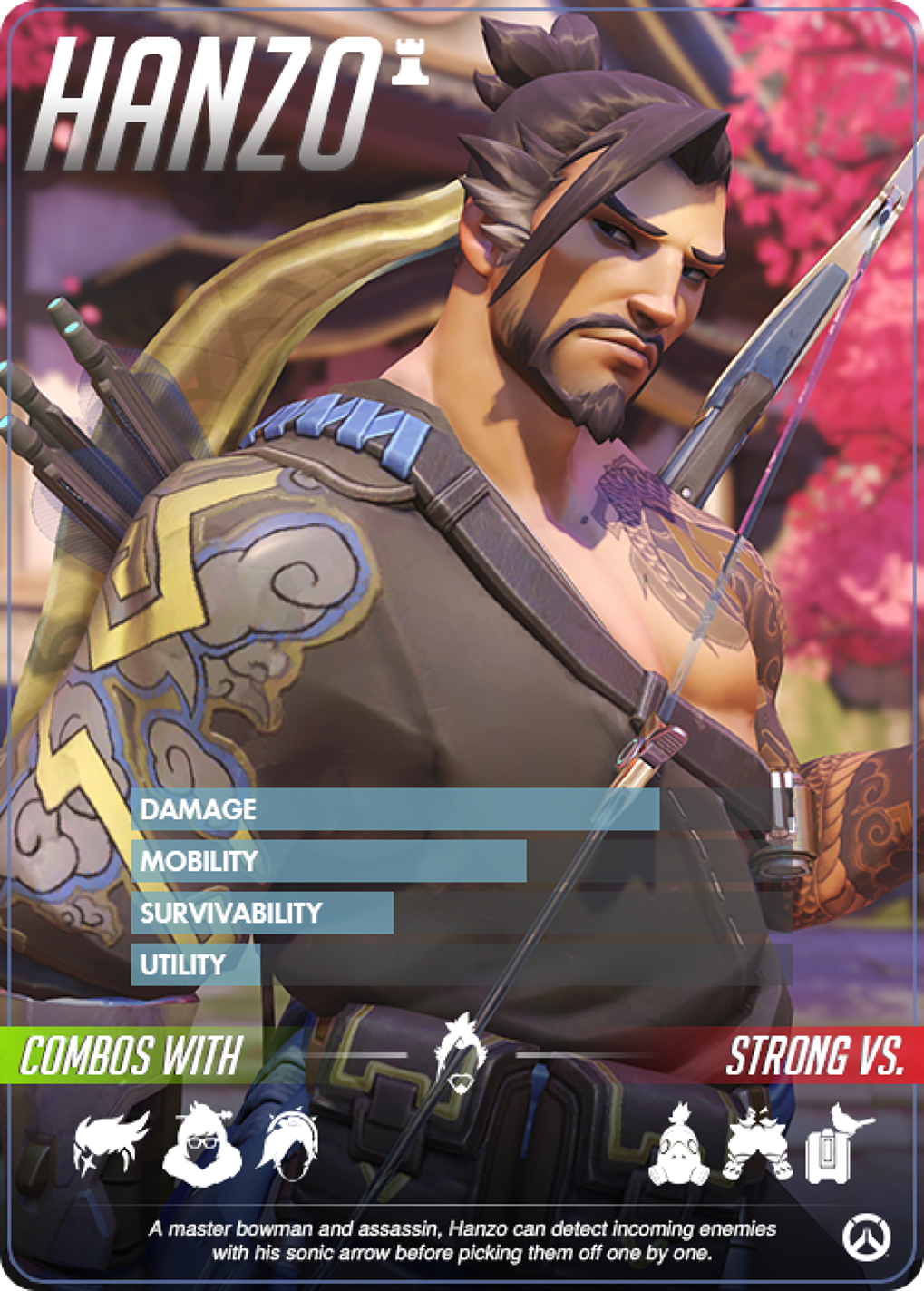 Hanzo เป็นฮีโร่กลุ่มสไนเปอร์ที่ทำงานได้ดีมากๆ ในระยะกลาง ละสามารถควบคุมพื้นที่ต่างๆได้ดี ด้วยสกิล SONIC ARROW ทำให้เราสามารถรู้ตำแหน่งของศัตรูในพื้นที่นั้นๆได้  สำหรับธนูของเขานั้นมีจุดเด่นที่แตกต่างกับสไนเปอร์อย่าง Widowmaker ตรงที่ว่ามันมีเสียงเบามาก และไม่เปิดเผยตำแหน่งตรงๆ และเขามีสกิลอย่าง Scatter Arrow ที่สามารถใช้ในห้องแคบๆได้ดีมาก โดยอาจจะทำให้ตัวบางๆอย่าง Tracer หรือ Genji ตายได้ในการยิงครั้งเดียวเลยทีเดียว รวมไปถึงแท้งอย่าง Reinhardt ก็อาจจะเจ็บปางตายได้เลยครับ แต่ถึงจะดูมีข้อดีที่มากก็จริง แต่ตัว Hanzo เองนั้นเมื่อถูกประชิดโดยฝ่ายตรงข้ามแล้ว เขาแทบจะไม่มีท่าที่ใช้หนีได้เลย ทำให้ถูกจัดการเอาได้ง่ายๆ และการเล็งโจมตีในระยะไกลของเขาค่อนข้างจะลำบากเพราะธนูมันไม่ซูมให้ แต่ตรงกันข้ามกัน ในระยะใกล้ธนูของเค้านั้นสามารถทำดาเมจได้สูงมาก หากเราไม่ลนและสามารถที่จะยิงใส่ศัตรูได้