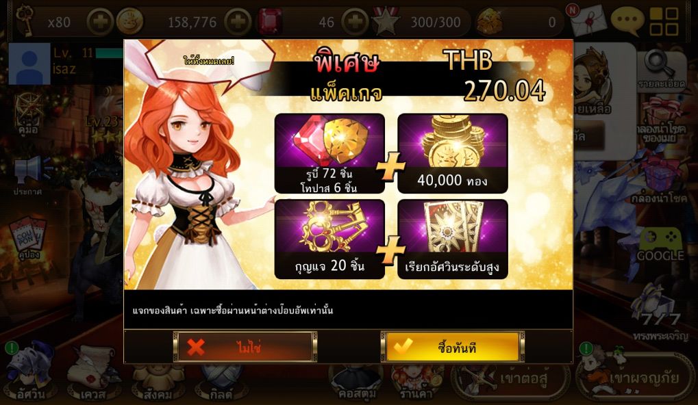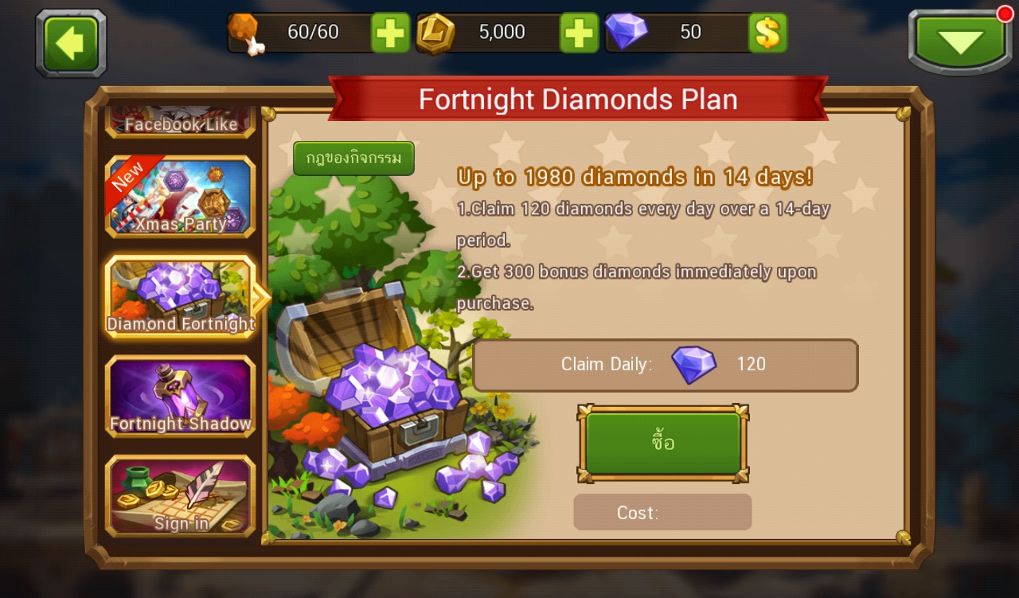 เมื่อกดครั้งแรกจะได้รับ 300 Diamond และต้องล๊อกอินต่อเนื่องทุกๆ วัน 14 วัน จะได้วันละ 120 Diamond