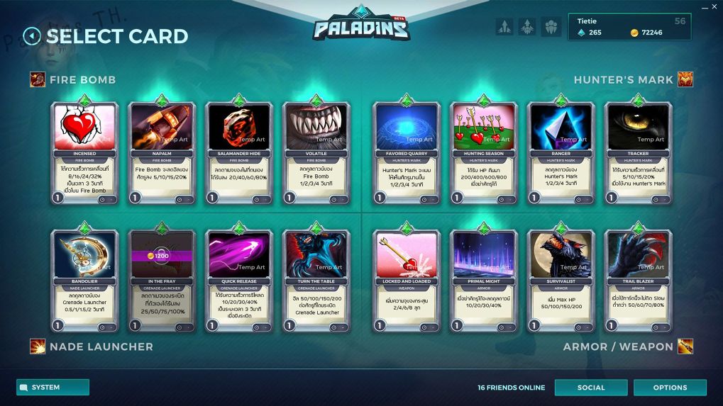 - เกมบางเกมอาจจะมีหลากหลายอาชีพหรือหลากหลายคลาสก็จริง แต่ในอาชีพเดียวกันนั้นกลับเหมือนกันไปหมดทุกอย่างไม่ว่าจะเป็น Skill, Status ฯลฯ ทำให้ไม่ค่อยเห็นความแปลกใหม่กันสักเท่าไหร่ แต่สำหรับ Paladins นี้ถึงแม้จะเป็นแชมเปี้ยนตัวเดียวกัน แต่รูปแบบการเล่นอาจจะไม่เหมือนกันก็ได้ ซึ่งตัวกำหนดรูปแบบการเล่นของแชมเปี้ยนแต่ละตัวนี้คือระบบการ์ดนั่นเอง การ์ดในเกม Paladins นี้สามารถเลือกใส่ได้สูงสุด 5 ใบจากทั้งหมด 16 ใบพร้อมทั้งเพิ่มความสามารถให้การ์ดได้สูดสุดที่เลเวล 4 ซึ่งเราต้องเลือกที่จะอัพจาก 12 แต้มในการ์ด 5 ใบนี้ว่าจะอัพให้เด่นไปทางไหนบ้าง ตัวการ์ดก็จะแสดงผลเพิ่มความสามารถส่งไปให้ตัวละคร ทำให้สร้างความแตกต่างกันพอสมควรในการเลือกรูปแบบการเล่นว่าเราจะเน้นไปทางไหนและออกไอเทมอะไรเพื่อซัพพอร์ทกับการ์ดที่เราจัดไว้ดี อ้อแล้วการ์ดนั้นหามาจากไหนอ่ะหรอ ?? การ์ดสามารถกดซื้อได้เลยโดยใช้ Gold ในเกม ซื้อได้ใบละ 1200 Gold ไม่ต้องมานั่งสุ่มหรือหาการ์ดแรร์จากการดรอปหรืออะไรทั้งนั้นหรอก ทุกคนสามารถจัดการ์ดเทพๆได้เท่าเทียมกัน ส่วนคนที่ยังจัดการ์ดไม่เป็น ระบบก็ยังมีฟังก์ชั่น Import การ์ดของเพื่อนๆที่จัดไว้ดูดมาเป็นของตัวเองได้ หรือไปส่องการ์ดของคนที่เล่นอยู่อันดับต้นๆของเซิฟเวอร์แล้วดูดมาใช้เองก็ได้เช่นกัน เยี่ยมเลยใช่ไหมล่ะ