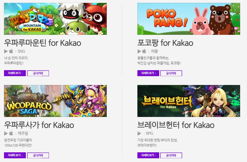 NHN คือบริษัท IT ซึ่งทำแอพพลิเคชั่นเกมลงในเพลทฟอร์มโทรศัพท์สมาร์ทโฟนต่างๆ ซึ่งมีเกมที่ได้รับความนิยมหลายเกมด้วยกัน โดยตัวอย่างเกมที่ทำอาทิเช่น우파루마운틴 for Kakao,포코팡 for Kakao,우파루사가 for Kakao,브레이브헌터 for Kakao