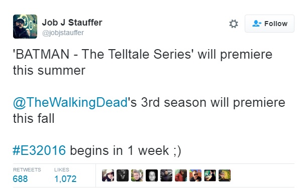 อย่างที่ทราบกันดีว่า Telltale Games ค่ายพัฒนาเกมขวัญใจเกมเมอร์ ผู้สร้างตำนานเกมแนว Point and Click อันโด่งดังอย่าง The Walking Dead บางคนที่ไม่เคยเล่นเกมนี้มาก่อน เกมนี้เป็นแนวที่ต้องเลือกคำตอบเพื่อให้ได้ผลลัพธ์ต่อไปแตกต่างกันเรื่อยๆ จนจบเกมมีฉากจบ Ending หลายแบบ ถ้าคนที่ติดตามข่าวของเกมค่ายนี้จะทราบว่าตอนนี้พวกเขากำลังพัฒนาเกมใหม่อยู่อีกหลายโปรเจค อาทิ Batman: A Telltale Game Series และ The Walking Dead: Season 3 โดยตอนนี้ Job J Stauffer : Creative ของทางค่ายได้ออกมาเผยกำหนดการณ์ปล่อยเกมทั้ง 2 ผ่าน Twitter ส่วนตัวดังนี้